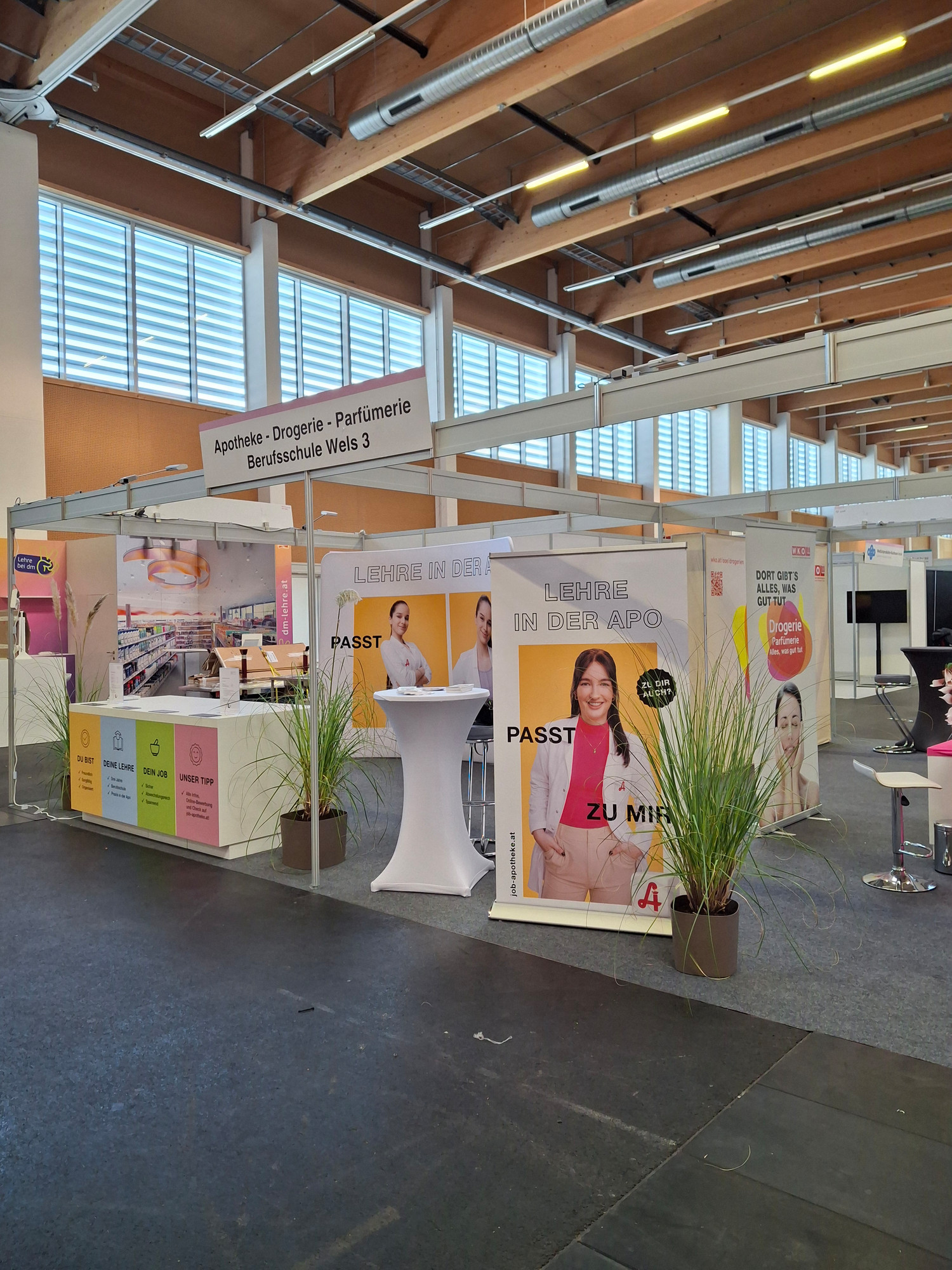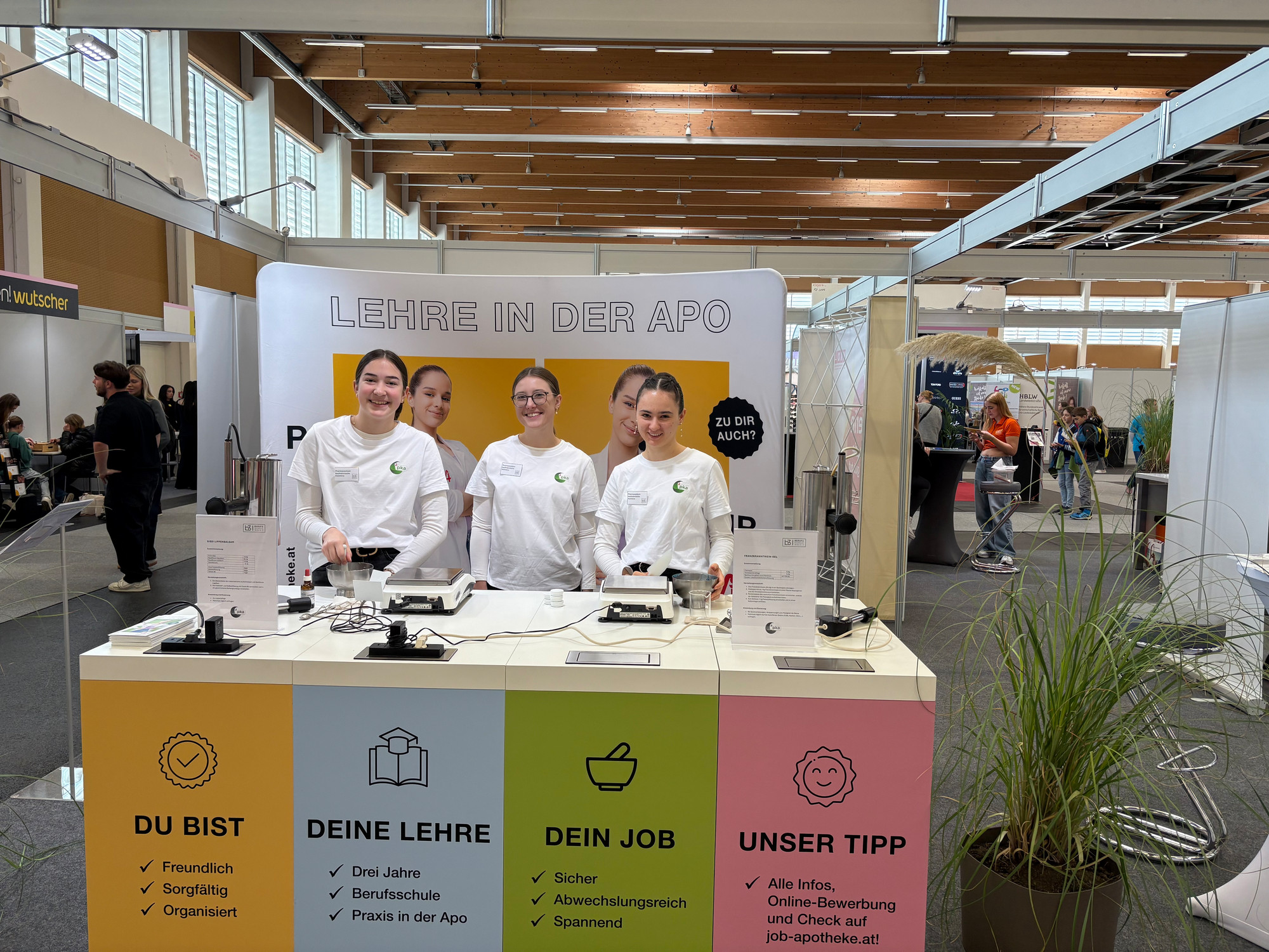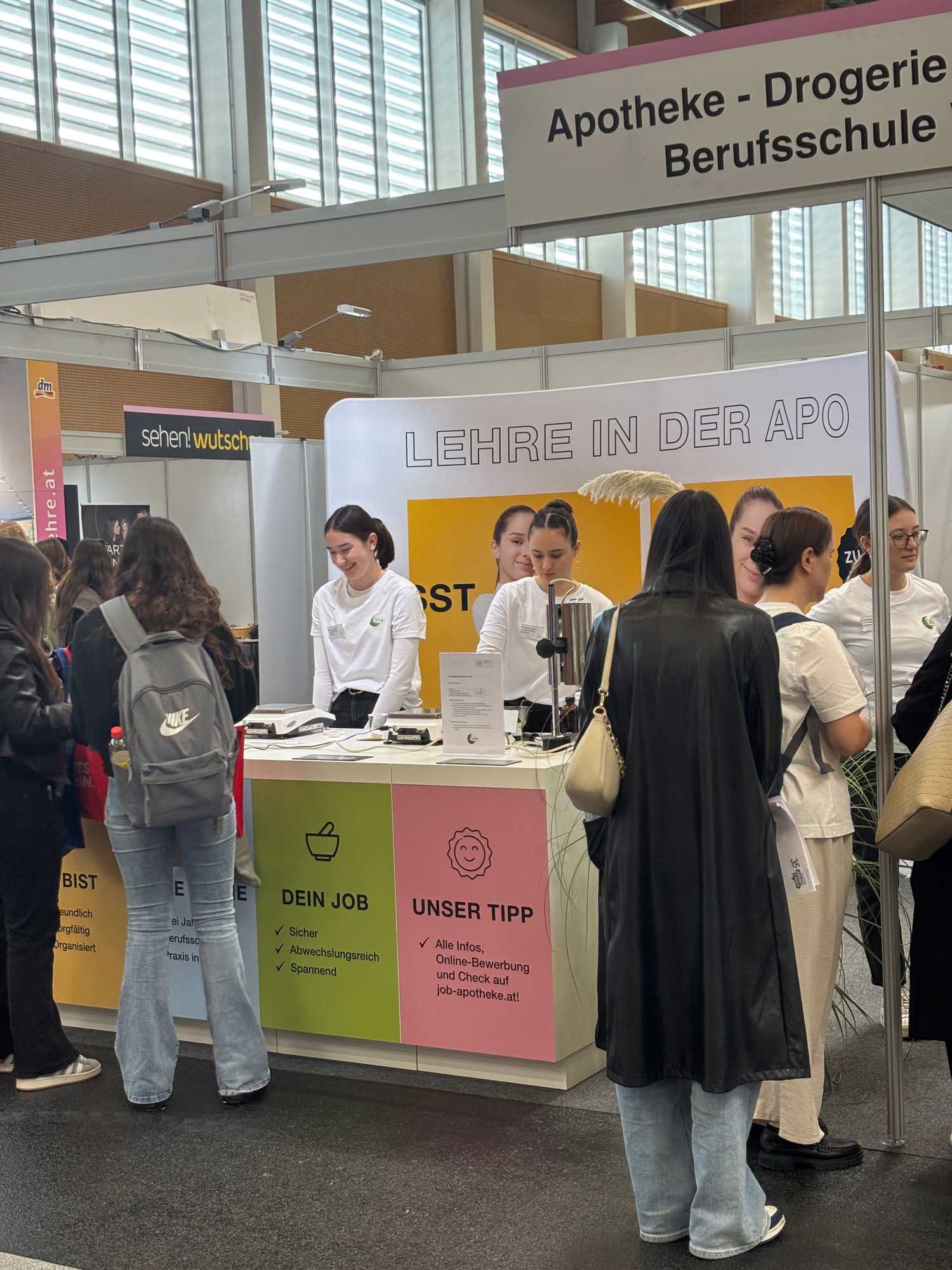 Fleißige Lehrlinge der Berufsschule Wels III waren von 4.-7. Oktober 2023 auf der Jugend & Berufsmesse in Wels zu finden. Neben dem Beantworten von Fragen gab es auch Einblicke in den Apothekenalltag und man bekam frisch am Stand hergestelltes Franzbrandweingel oder einen roten Lippenbalsam als Erinnerung mit nach Hause!
